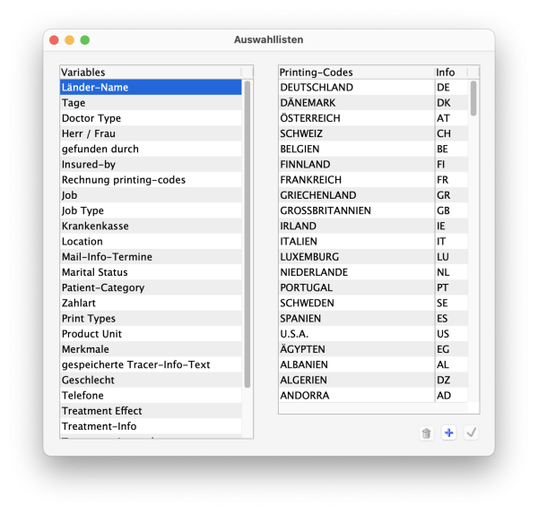 Die Listen-Einträge (Inhalte) können hier im Programmfenster „Auswahllisten“ mit dem Plus- und Mülltonnenbutton bearbeitet werden. Durch einen Doppelklick auf eine Spalte im linken Anzeigebereich kann der Listen-„Name“ bearbeitet werden.