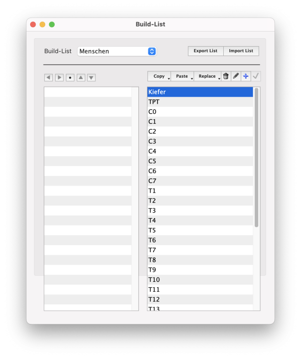 Im Menü Einstellungen unter dem Punkt „Diagnose-Listen“ können bestehende Build-Listen (Diagnose-Listen) zusammengefasst gesichtet und bearbeitet werden. Hier finden sich neben der fest installierten Build-List auch alle Listen, welche unter „Einstellungen“ / "Journal-Daten" mit entsprechenden Beschreibungen verknüpft sind.