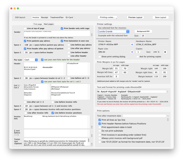 Im Layout-Tab „Invoice“ können Sie verschiedene Einstellungen definieren, um den Drucker für Ihre Rechnungen bzw. das Layout dafür zu konfigurieren. Des Weiteren können Sie hier wählen zwischen dem Tab „Fist page“ (Layout: Seite 1 der Rechnung) und „Next page“ (Layout: Folgeseiten der Rechnung).