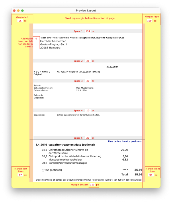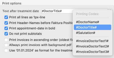 - Print Options „Text after Treatment date“: definiert den Text für den Arzt bzw. Chiropraktor der auf einer Rechnung im Bereich „Space 5“ ausgegeben werden soll, z. B. Name und Titel der behandelnden Person.