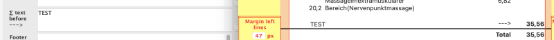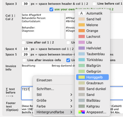 - Optionaler Text für Positionen in Rechnungen: Im Feld „∑ text before —>“ kann ein Text eingegeben werden, der bei der Rechnung links von dem Rechnungsbetrag angezeigt wird. Zeichensatz.