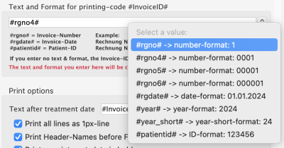 - Text and Format for printing-code #InvoiceID#: dieser Eingabebereich definiert die Art bzw. Zusammensetzung der von dem System erstellten fortlaufenden Rechnungsnummer, welche Sie über Textbausteine aus dem seitlichen Auswahlmenü bestimmen können.