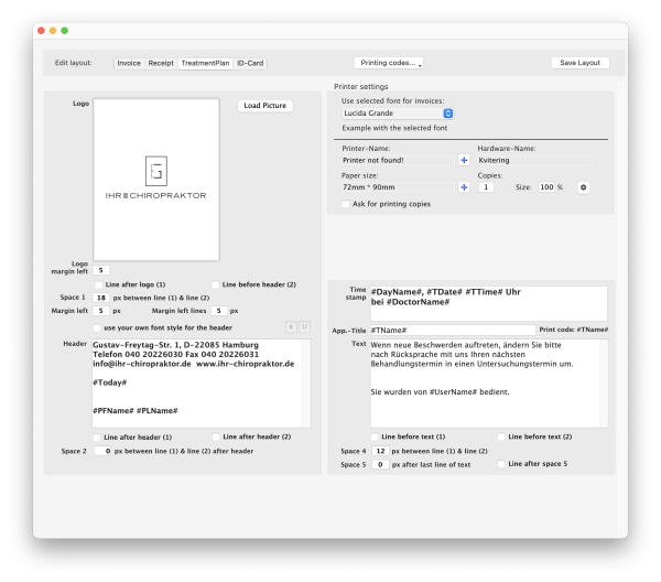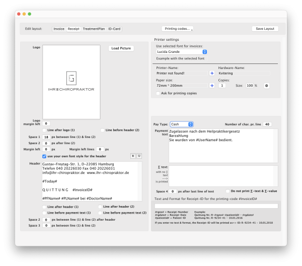 Im Menü „Einstellungen“ und mit dem Befehl „Drucker konfigurieren“ können folgende Druckereinstellung vorgenommen werden; für Rechnungen (Invoice), Quittungen (Receipt), Terminzettel (Treatmentplan) und für die Patienten-ID-Karten (ID-Card). Ebenso kann definiert werden, aus welchem Drucker z.B. die Quittungen oder Rechnungen gedruckt werden können.