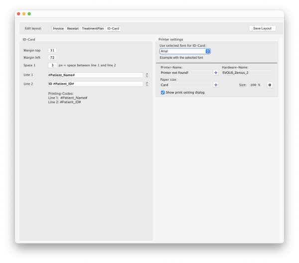 Im Layout-Tab „ID Card“ können Sie verschiedene Einstellungen definieren, um den Drucker für Ihrer ID-Karten bzw. das Layout dafür zu konfigurieren.