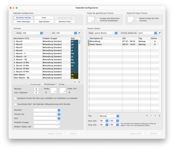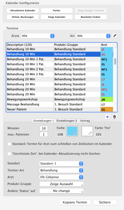 Im unteren Auswahlmenü, im Tab „Einstellungen-1“, können Sie dem Termin weitere Faktoren zuordnen, wie Terminfarbe (Darstellungen im Kalender), Terminzeit, Arzt, Max. Patienten, Termin-Art, Produktgruppe (Wichtig für die Abrechnung) etc.