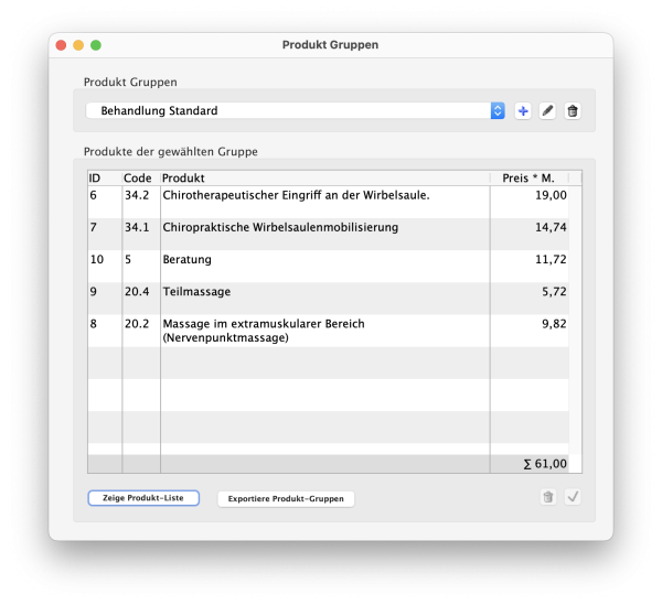 Anschließend definieren Sie die Produkte (Leistungen) für die Produkt-Gruppe über den Button „Zeige Produkt-Liste“. Durch Klicken des Buttons öffnet sich das Programmfenster „Produkte“ mit der Liste der gespeicherten Produkte bzw. Behandlungspositionen (Leistungen). Durch Ziehen per Drag & Drop, können Sie das gewünschte Produkt in den angezeigten Listenbereich des Produkt-Gruppen Programmfensters einfügen.