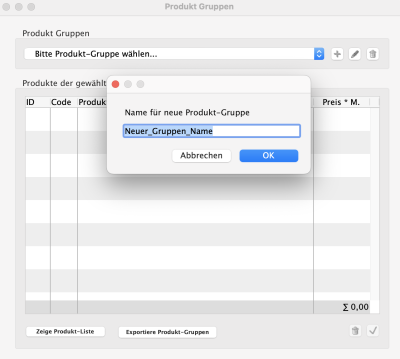 Die Konfiguration einer neuen Produkte-Gruppe können Sie im Menü Einstellungen oder dem Punkt „Produkt-Gruppen“ tätigen. Klicken Sie dazu im Programmfenster „Produkt-Gruppen“ auf den Plus-Button und geben Sie eine Bezeichnung für die neu angelegt Gruppe ein.