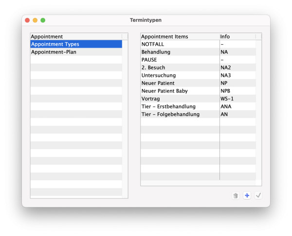 Zum Anlegen eines neuen Typs klicken Sie auf den Plus-Button und geben die gewünschte Bezeichnung für den Termintyp ein. Zum Sichern Ihrer Eingabe klicken Sie auf den Haken-Button, zum Löschen von bereits bestehenden Eingaben oder Typen klicken Sie auf die Mülltonne.