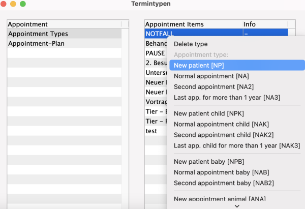 Im Menü Einstellungen unter „Termintypen“ können Sie die Termintypen konfigurieren, welche es für Ihren Kalender geben soll. Ebenfalls kann hier auch definiert werden, wie der Behandlungsplan aussehen soll.