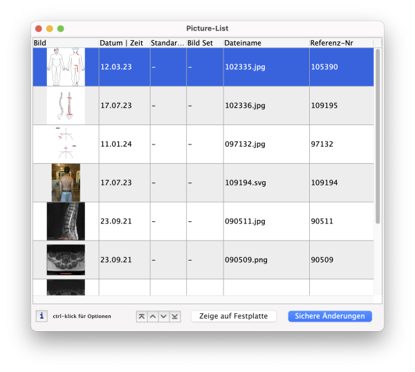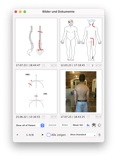 Das Programmfenster „Bilder und Dokumente“ dient zur Dokumentation, Anamnese, Diagnostik und Befundaufnahme. So kann beispielsweise der Chiropraktor, Behandler oder Therapeut die Beschwerden vom Patienten in den System-Vorlagen bildlich dokumentieren, z.B. durch Einzeichnen oder Fotografieren.