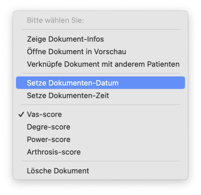 Wurde einem Bild bzw. Dokument beim Import in das Programmfenster „Bild und Dokumente“ kein oder ein falsches Datum oder Zeit zugewiesen, kann dies leicht geändert werden. Aktivieren Sie das gewünschte Bild mit einem Mausklick und klicken Sie auf den Mini „Plus“-Button rechts unter dem Bild. Wählen Sie nun aus dem Einblendmenü den Befehl „Setze Dokumenten-Datum“ oder „Setze Dokumenten-Zeit“.
