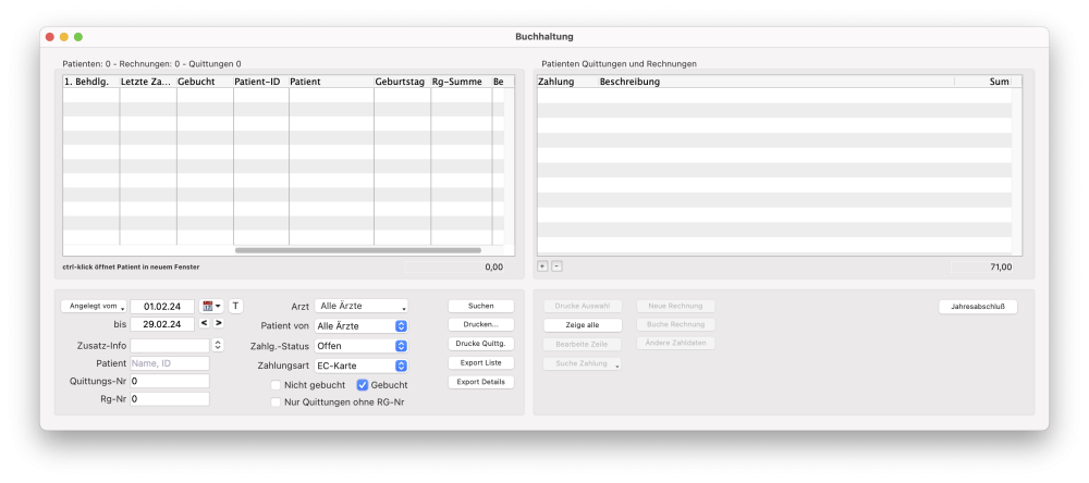 Patienten, welche auf Rechnung zahlen, können hier als bezahlt ausgebucht werden. Somit behält die Buchhaltung den Überblick, welche Rechnungen noch offen sind.