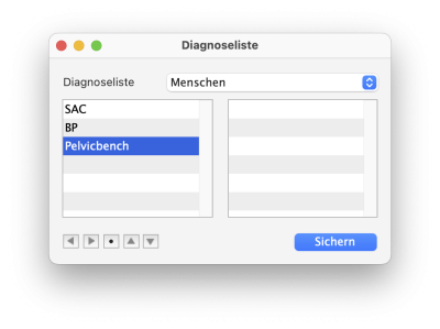 Wenn Sie sich in der Evaluation befinden, wählen Sie aus dem Programmfenster „Diagnoseliste“ die entsprechenden Wirbel-Segmente, Gelenke oder Bereiche mit einem Doppelklick und bestätigen Sie die Eingabe mit Sichern, um Ihre Auswahl in die Evaluation zu übernehmen.