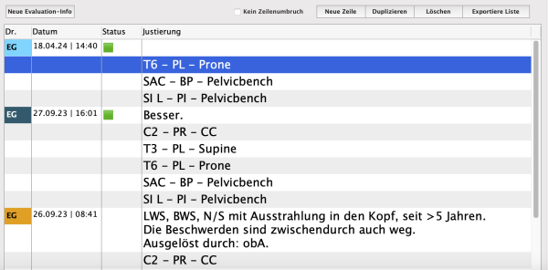 Die Evaluation dient der Dokumentation von Behandlungen durch die Chiropraktoren bzw. Behandler. Hier werden bei jedem Termin die Informationen zur Behandlung und der aktuelle Befund notiert bzw. können aus der Diagnoseliste entsprechende Einträge gewählt und hinzugefügt werden.