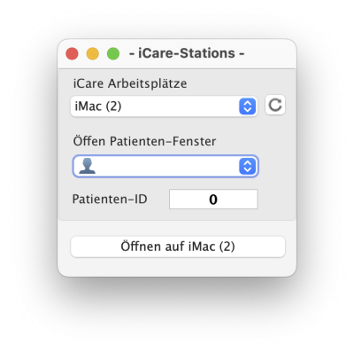 Mit dem Programmfenster „iCare-Stations“, welches Sie unter dem Menü „MedPlan“ / „iCare Arbeitsplätze“ aufrufen, können Sie eine ausgewählte Patientenkartei von Ihrem Computer bzw. iCare-Arbeitsplatz auf einen anderen Computer bzw. iCare-Arbeitsplatz per remote öffnen.