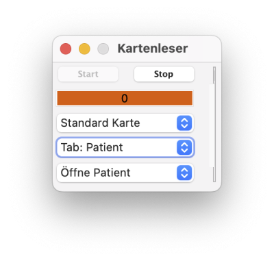 Über das Programmfenster „Kartenleser“ kann die ID-Karte eines Patienten mit der Funktion „Verknüpfe mit Patient“, wählbar aus dem unteren Einblendmenü, beim Ersttermin verlinkt werden. Die auf der Karte gespeicherte ID-Nummer wird dann in der geöffneten Patientenkartei unter dem Tab „Patient“ im Feld „Karten ID“ eingefügt. Jede ID-Karte sollte auf diese Art mit ihrer Nummer in der Kartei des Patienten hinterlegt werden.