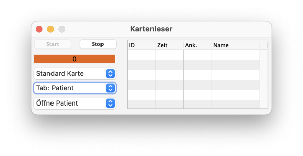 Es wird eine neue, noch leere Liste angezeigt mit den Spalten „ID“, „Zeit“, „Ank.“ und „Name“. Hält nun ein Patient seine ID-Karte auf den Kartenleser, wird nicht mehr das Patienten-Fenster geöffnet oder die Patientendaten im bereits geöffneten Fenster angezeigt, sondern seine ID, Termin- und Ankunftszeit werden in eine neue Zeile im Kartenleser-Programmfenster eingefügt. Folgen weitere Patienten, wird die Liste mit den entsprechenden Daten ergänzt.