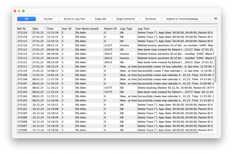 Im Menü „MedPlan“ gelangen Sie über den Befehl „Logbucheinträge“ zur Dokumentation von verschiedenen User-Aktionen wie Terminvergabe, Terminabsage, Löschen von Traces oder Rechnungen etc. Die Daten werden u.a. mit Datum, Mitarbeiter und einem Log-Text zur Beschreibung der durchgeführten Aktion gespeichert.