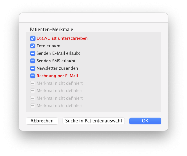 Durch Klicken auf die Lupe und Auswählen des Suchbefehls „Patienten Merkmale“, können Sie Patienten mit bestimmten Merkmalen (Einstellungen in der jeweiligen Patientenkartei) suchen, wie beispielsweise „DSGVO ist unterschrieben“, „Foto erlaubt“, „Senden E-Mail erlaubt“, „Senden SMS erlaubt“, „Newsletter zusenden“, „Rechnung per E-Mail“.