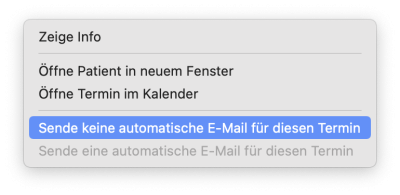 Hinweis: Bei Bedarf kann bei jeder o.g. Auswahloption, durch die rechte Maustaste bzw. einen CTRL-Klick auf eine angezeigte E-Mail und der Optionsauswahl „Sende keine automatische E-Mail für diesen Termin“, der Versand für den markierten Termin gestoppt werden.