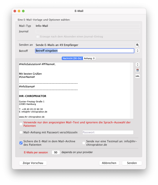 Durch Klicken auf die Lupe und Auswählen des Suchbefehls „Sende E-Mail…“, können Sie eine E-Mail sowie Sammel- & Rundmails an ausgewählte Patienten versenden.