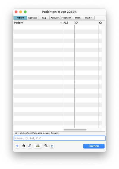 Wenn Sie eine neue Patientenkartei anlegen möchten, klicken Sie am unteren Tab Rand den „+“ Button. Automatisch wird eine leere Patientenkartei im Patienten-Fenster mit neuer ID-Nummer angelegt und die Daten des Patienten können eingegeben werden.