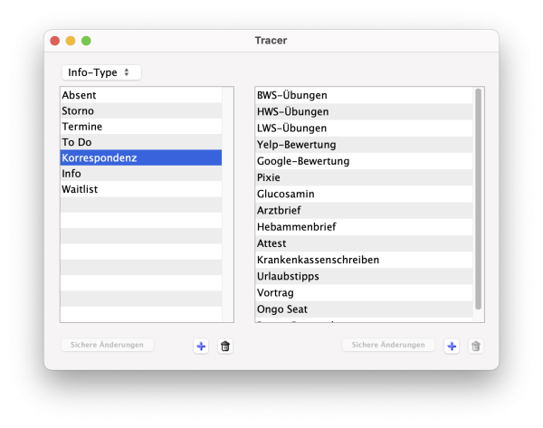 Im Programmfenster „Tracer“ können individuelle Textbausteine und Info-Typen für das Arbeiten mit der Trace-Funktion (iCare Praxismanagement-Tool / im "Patienten-Fenster" bzw. "Tägliche Arbeiten"-Programmfenster) hinterlegt werden.