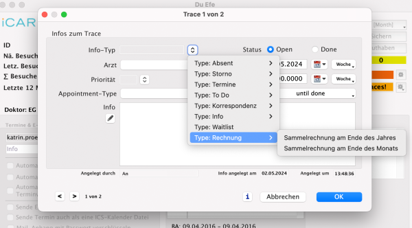 Mit einem „Traces“ kann, z.B. der Therapeut Erinnerungsfunktion und To-Dos in separaten Patientenakten hinterlegen. Durch bereits gespeicherte Textbausteine und Info-Typen im Programmfenster „Tracer, kann die Texteingabe vereinheitlicht sowie Arbeitszeit bei der Erstellung eines „Traces“ eingespart werden.